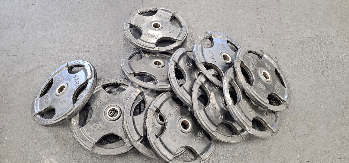 45 lb plates (23) metal collars in great shape; missing/cracked rubber coating