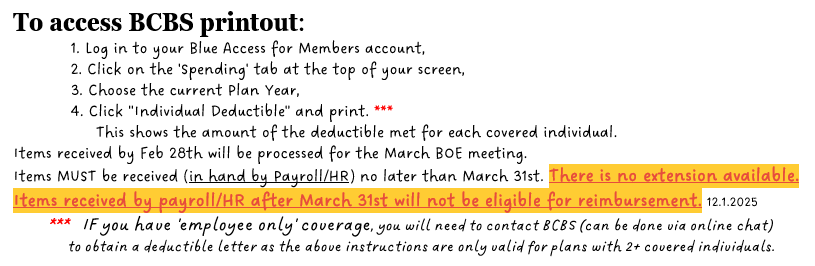 HRA Deductible Reimbursement Form 25-26 Complete this form and send with your Explanation of Benefits (EOB) (or BCBS printout showing deductible amount met) to the Unit Office Attn: H. Crane. REMINDER: The district does not reimburse Out-Of-Pocket expenses. Reimbursement is only available to those who elected the HRA-PPO for their medical coverage. Not available for HSA-PPO covered employees. Reimbursement amounts are based on Biometric Screening participation.